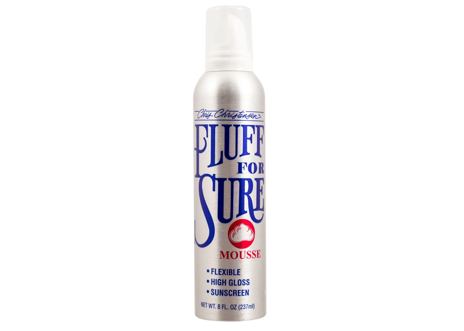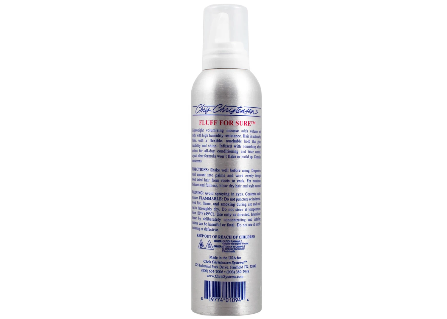 Fluff For Sure is a lightweight, volumizing mousse that adds fullness and body, with high humidity resistance. Hair is noticeably fuller, with a flexible, touchable hold that has durability and shine. Infused with nourishing wheat protein for all-day conditioning and frizz control. Crystal clear formula will not flake or build up. Contains sunscreens.