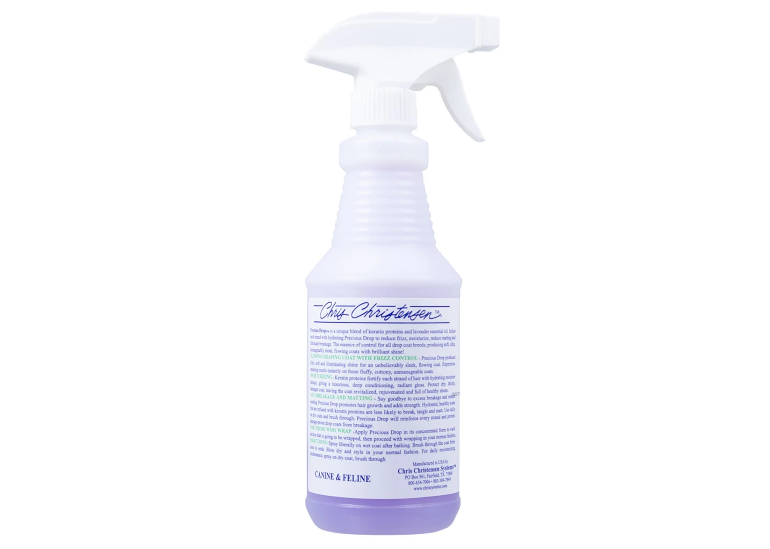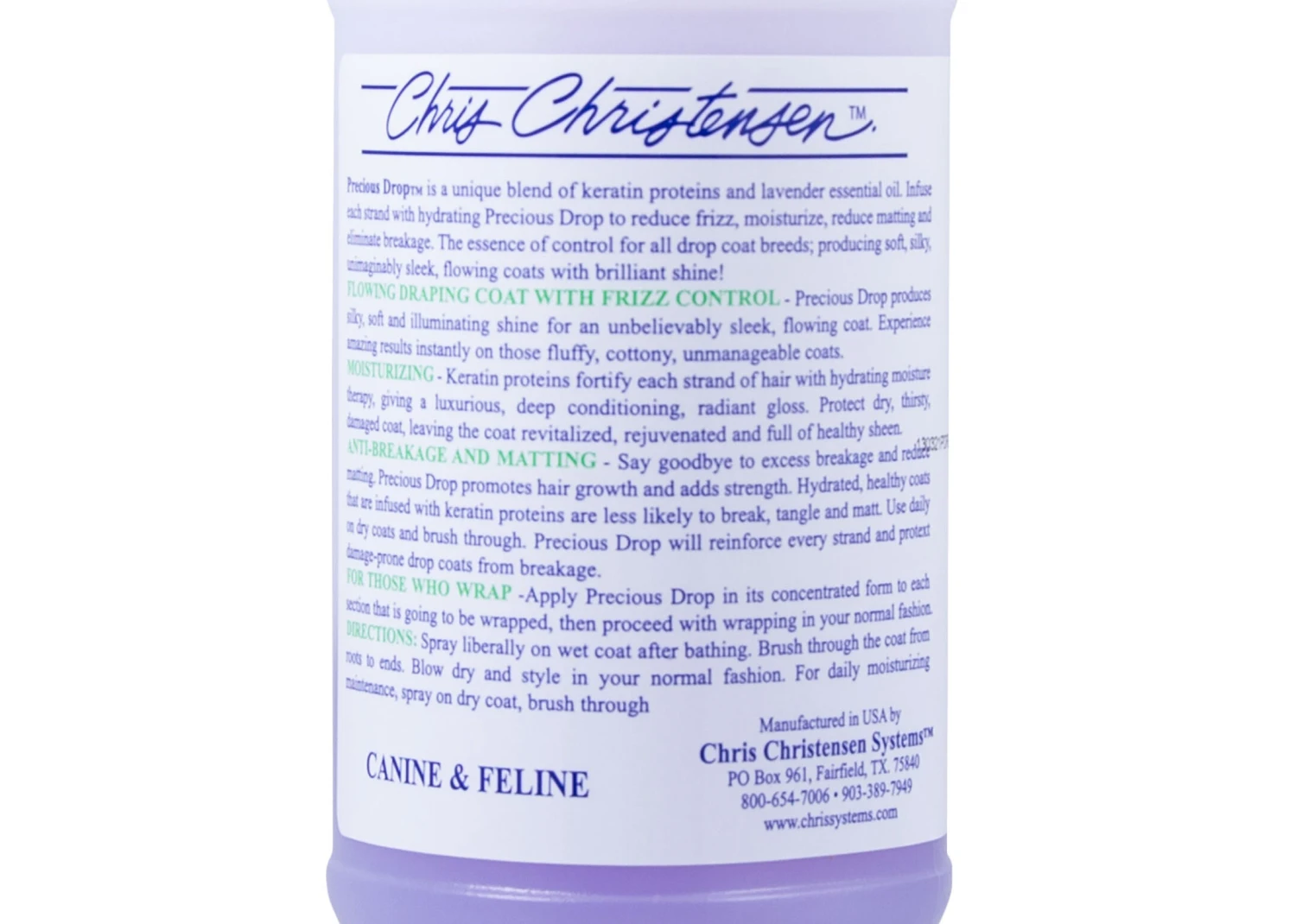 Precious Drop is a blend of Keratin Proteins and essential oils of Lavender Blossom. Infuse each strand of the hair with hydrating Precious Dropâ„¢ to reduce frizz, moisturize, reduce matting and eliminate breakage. The essence of control for all silky, unimaginably sleek, flowing coats with brilliant shine!drop coat breeds; producing soft, silky, unimaginably sleek, flowing coats with brilliant shine!