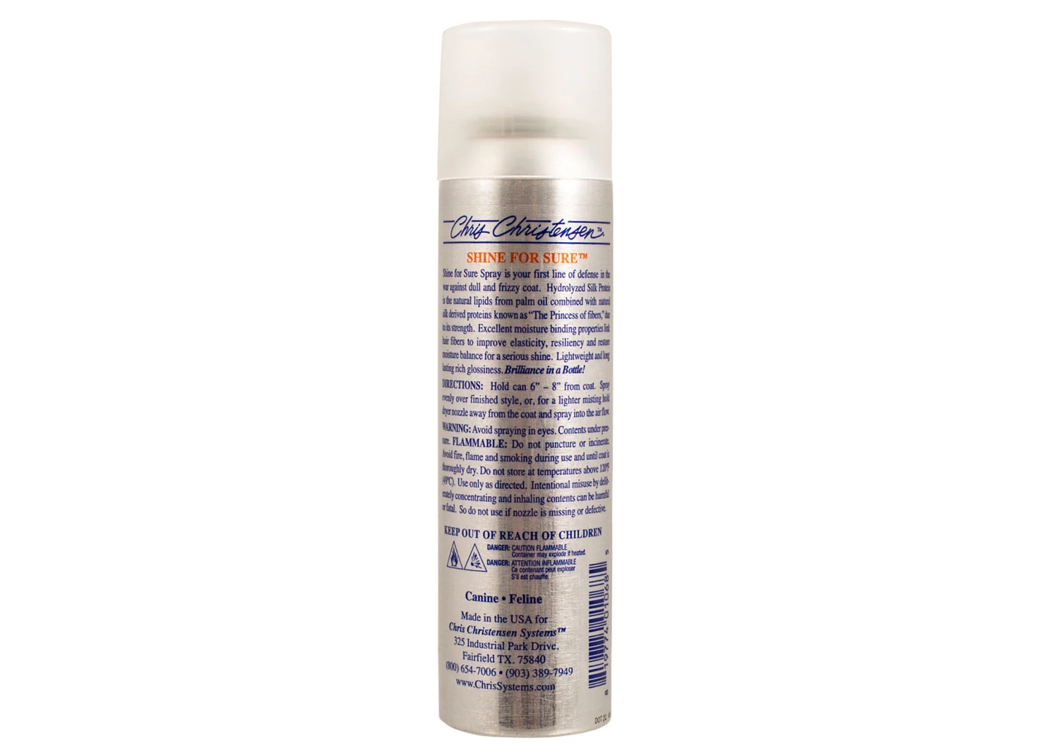 Shine for Sureâ„¢ spray is your first line of defense in the war against dull and frizzy coat. Hydrolyzed Silk Protein is the natural lipid from palm oil combined with natural silk derived proteins known as “The Princess of Fibers,” due to its strength. Excellent moisture binding properties link hair fibers to improve elasticity, resiliency and restore moisture balance for a serious shine. Lightweight and long lasting rich glossiness.