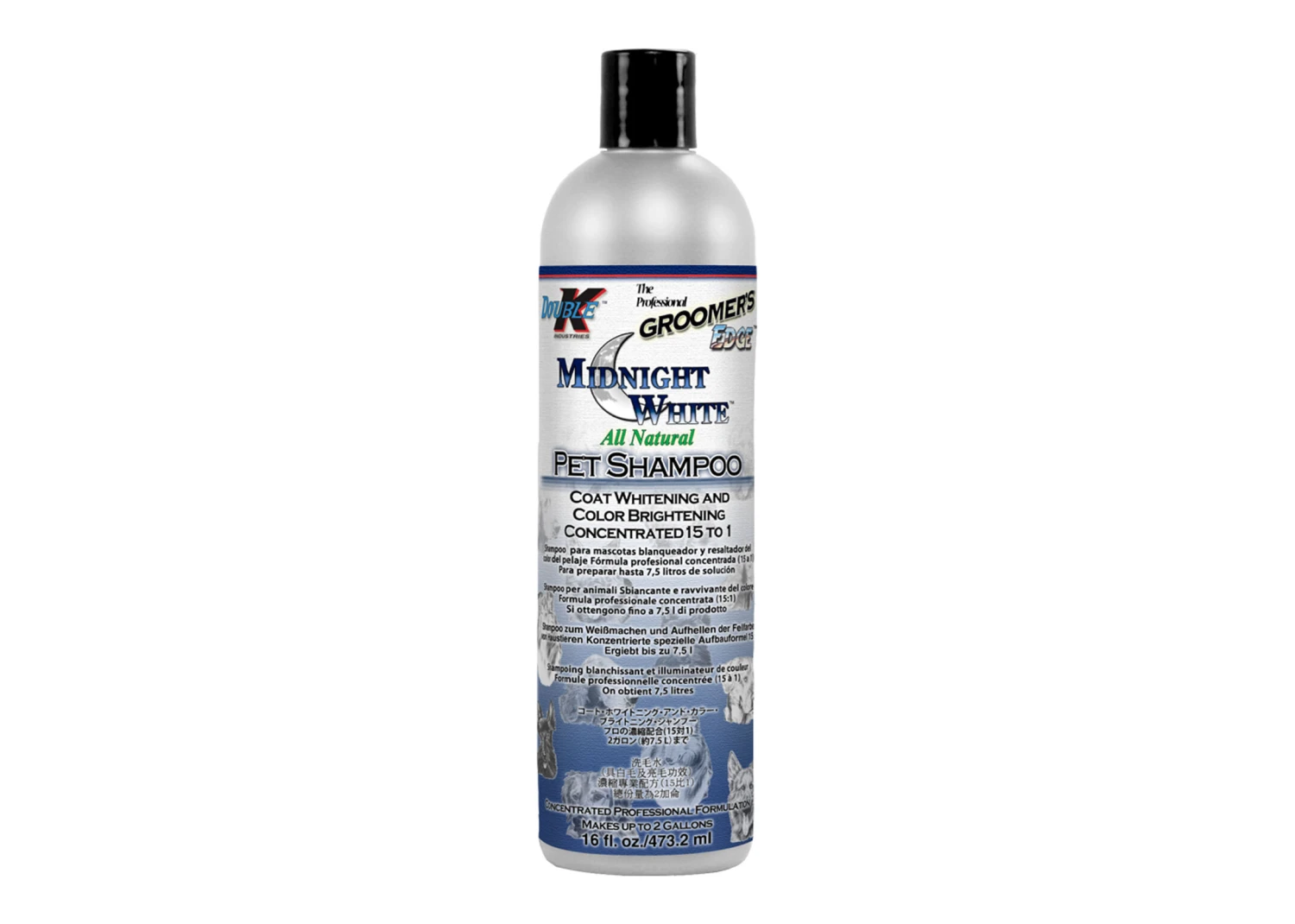 Double K MIDNIGHT WHITE professional shampoo cleans, conditions and brightens white coats and enhances coloured coats. Removes stains and odours. Leaves hair lustrous and healthy with a fresh clean scent! pH balanced especially for animals. The unique formula of MIDNIGHT WHITE with Aloe, Panthenol and Vitamin E gently cleans, while maintaining the natural moisture balance in both skin and hair. Great for dogs, cats, puppies, kittens and all companion and farm animals. Concentrated 15 to 1 and available in 473ml and 3.8L.