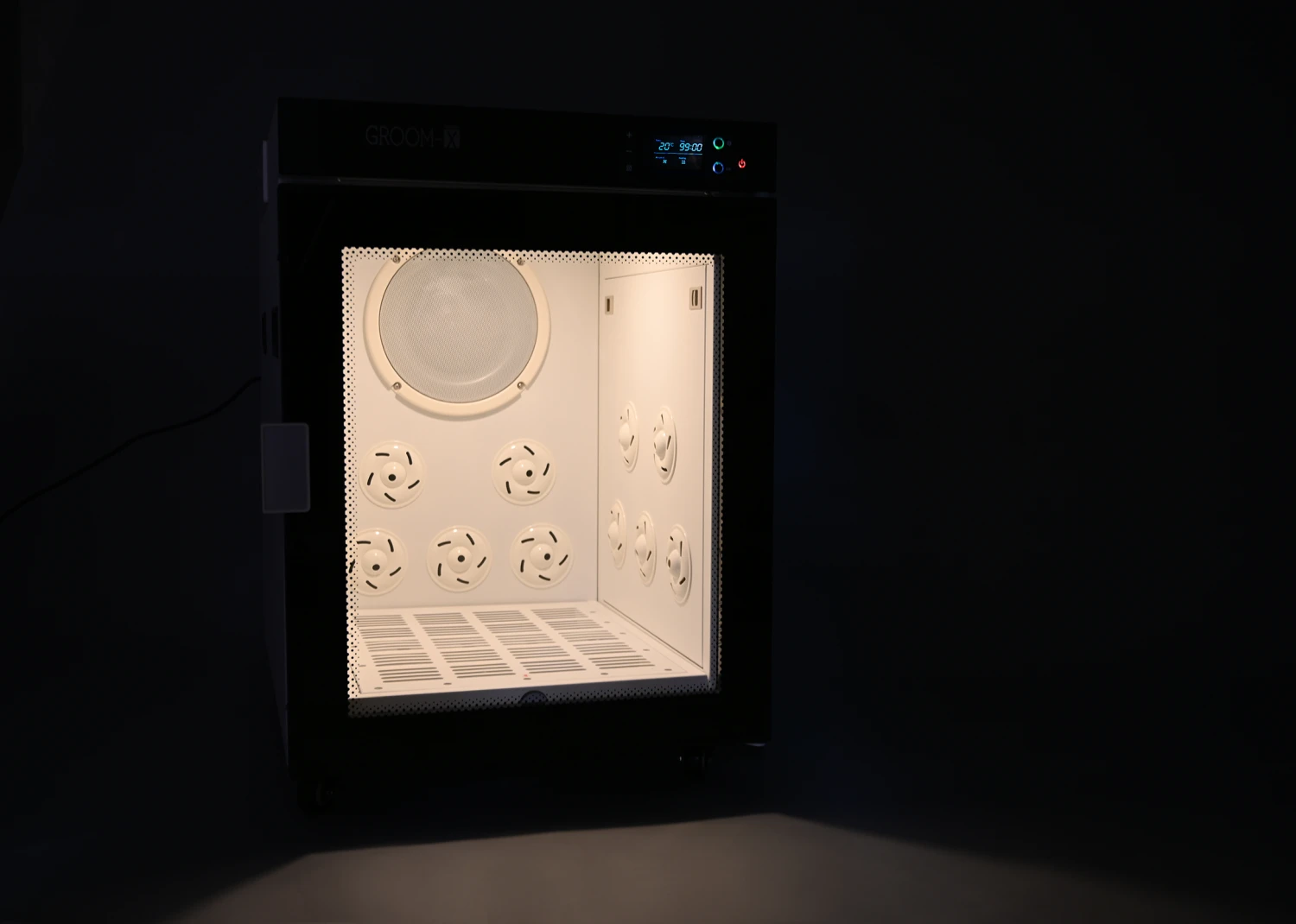 Efficient drying depends on good air volume, which this dryer produces in abundance. There are 15 air nozzles to balance air distribution in the cabin, even blowing under the floor grid so that pets are also dried quickly when they are lying down. Fresh air enters the cabin through a filter to ensure a good supply of oxygen.