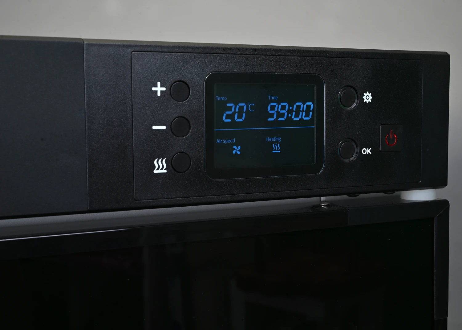The temperature of this cabin dryer can be kept constant between 20-40°C and can easily be regulated with the plus and minus button. On the display, you are able to see at any time what the current temperature is. We recommend setting it at a temperature between 36 and 38 degrees, depending on the season and the dog.