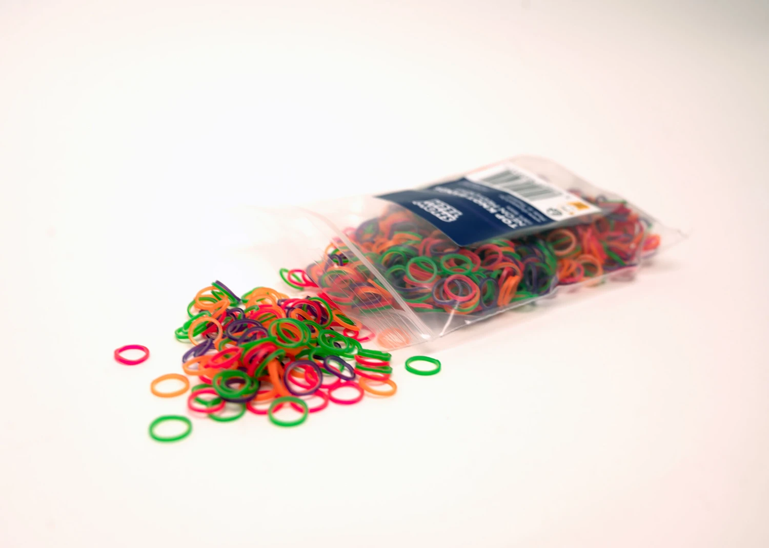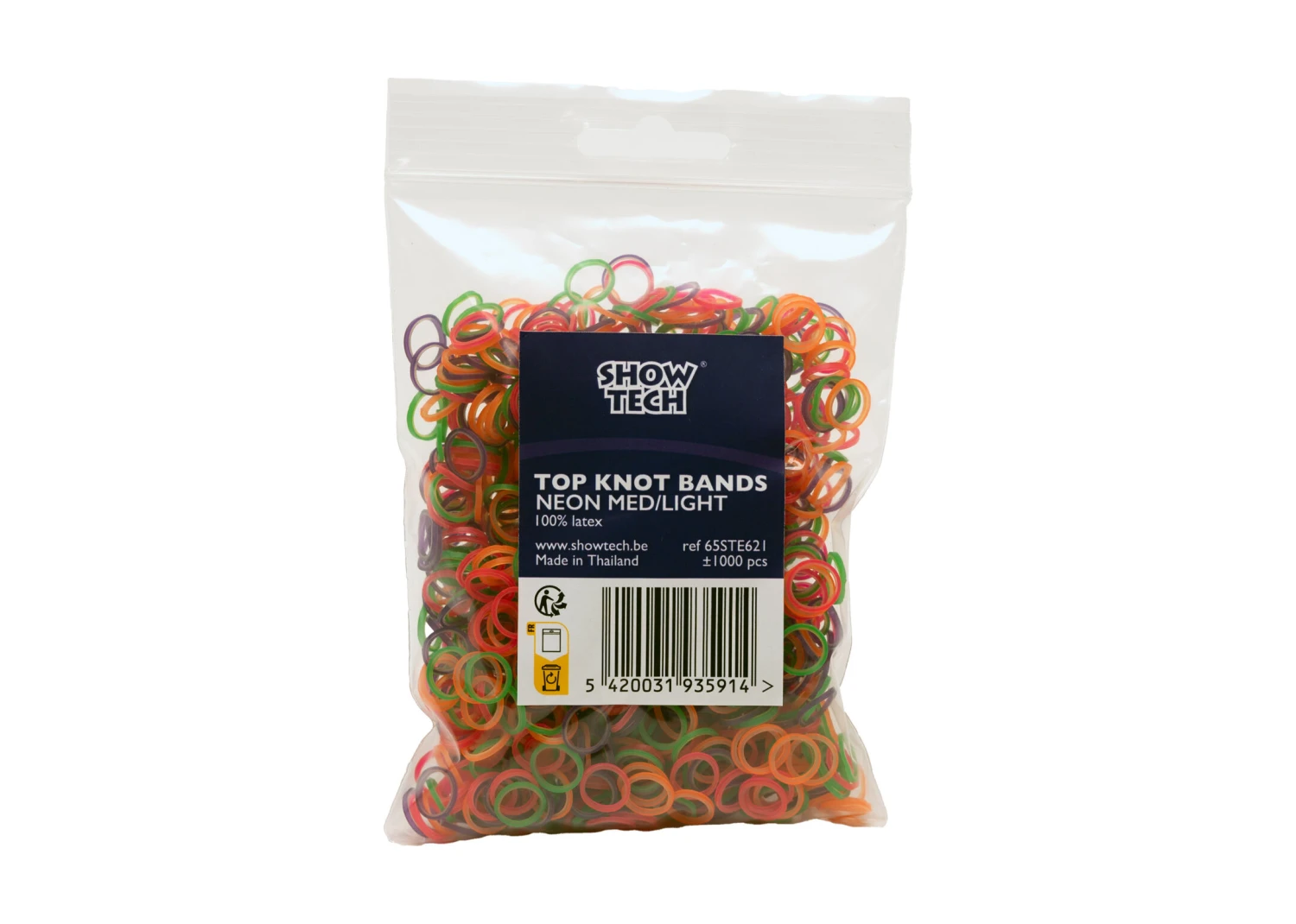These light, latex bands also measure 8 mm in diameter but are much thinner and more flexible than our regular top knot bands and will not to damage the coat. Available in bags of 100 and 1000 pieces in mixed, neon colours.