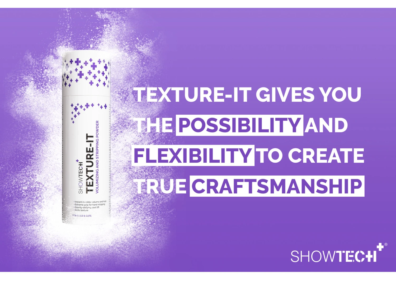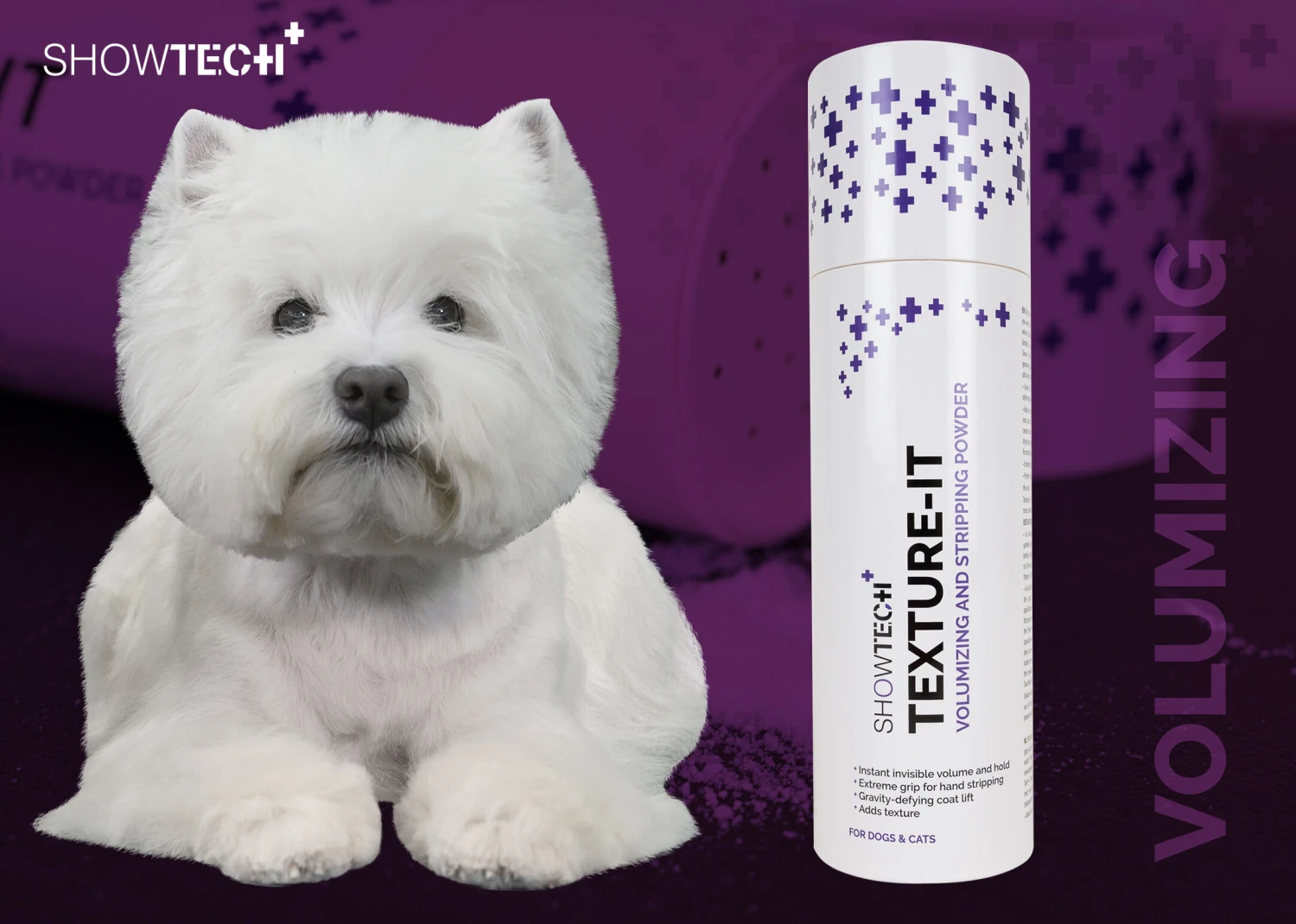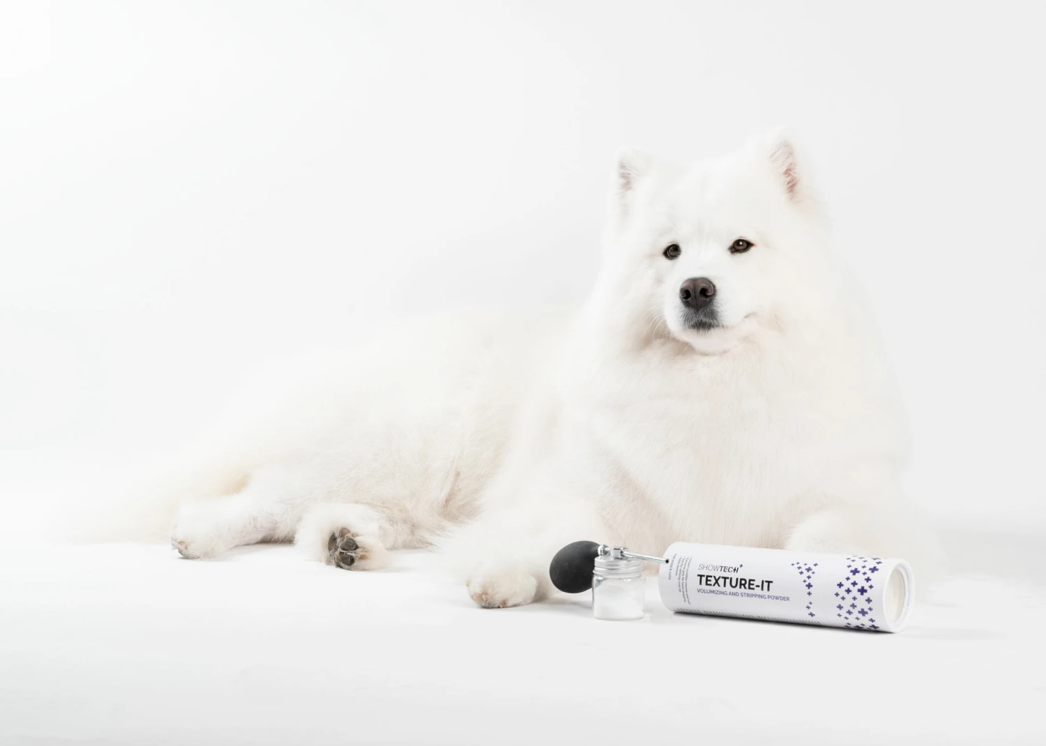 The Show Tech+ Texture-IT Powder is perfect as well for use in grooming salons when scissoring and styling the hair of older dogs. These dogs often have less hair that does not stand up easily anymore. By using this amazing powder, scissoring and styling will be much easier because the hair will stand up straight again.