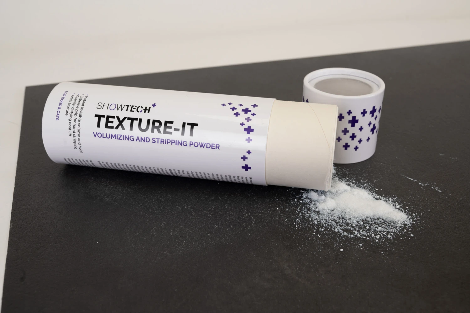 You can dust this powder on the coat for more precise hand-stripping. It is easy to apply on the coat thanks to the sifter in the top of the container or, even better, with the Show Tech+ Powder Puffer, even on body parts that are harder to reach. The great thing about this powder dispenser is that there is no danger of powder getting clogged in the nozzle. - As volume, texturizing and styling powder: