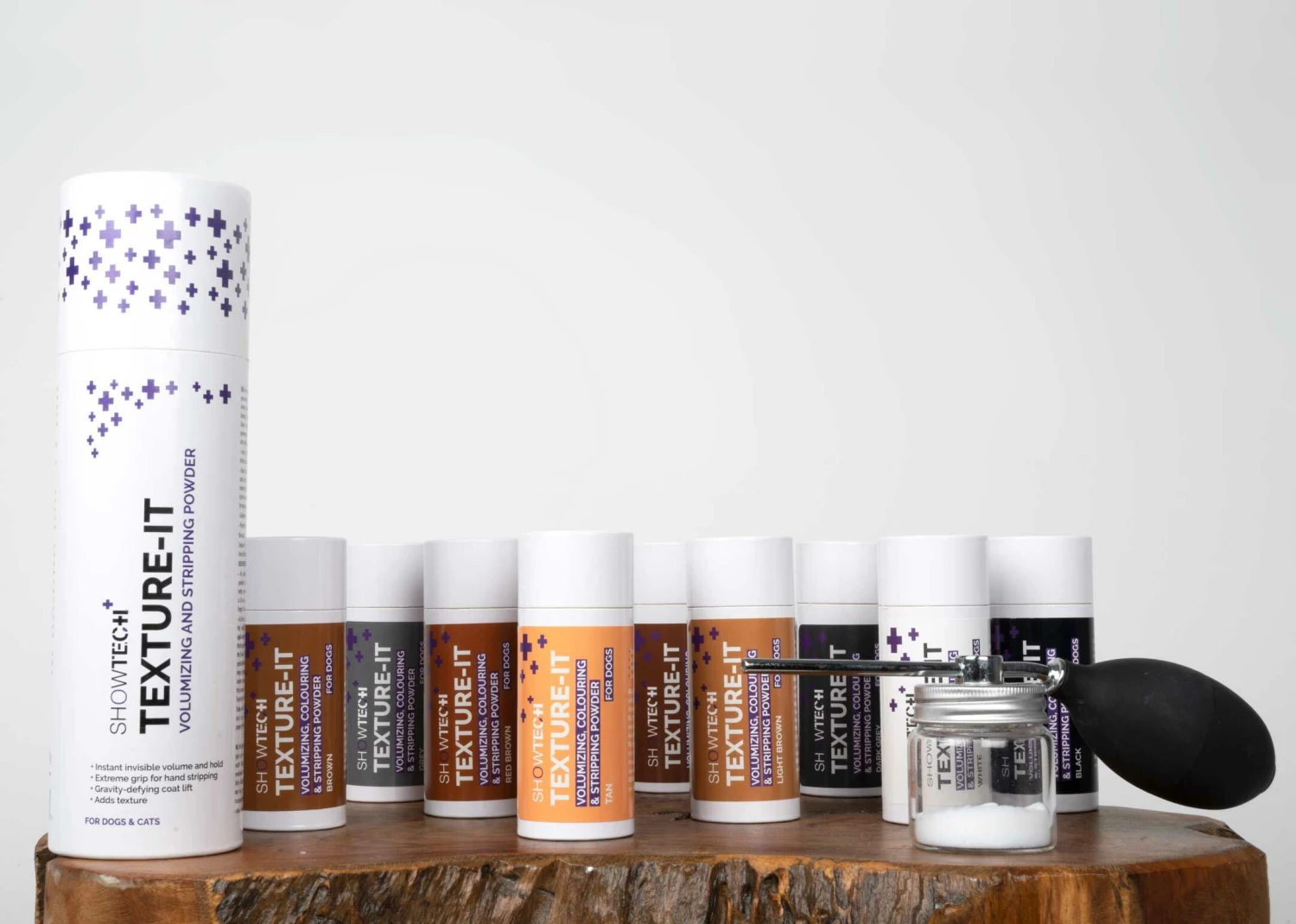 This in-house made coloured Texture-IT powder provides extra grip when plucking wire-haired breeds or other coats that need hand-stripping and allows you to perfectly model and style the furnishings, the longer hairs on the legs, tail and head. It adds volume to the coat, giving it body and texture. At the same time, it makes the hair stronger. The use of a hairspray becomes superfluous.