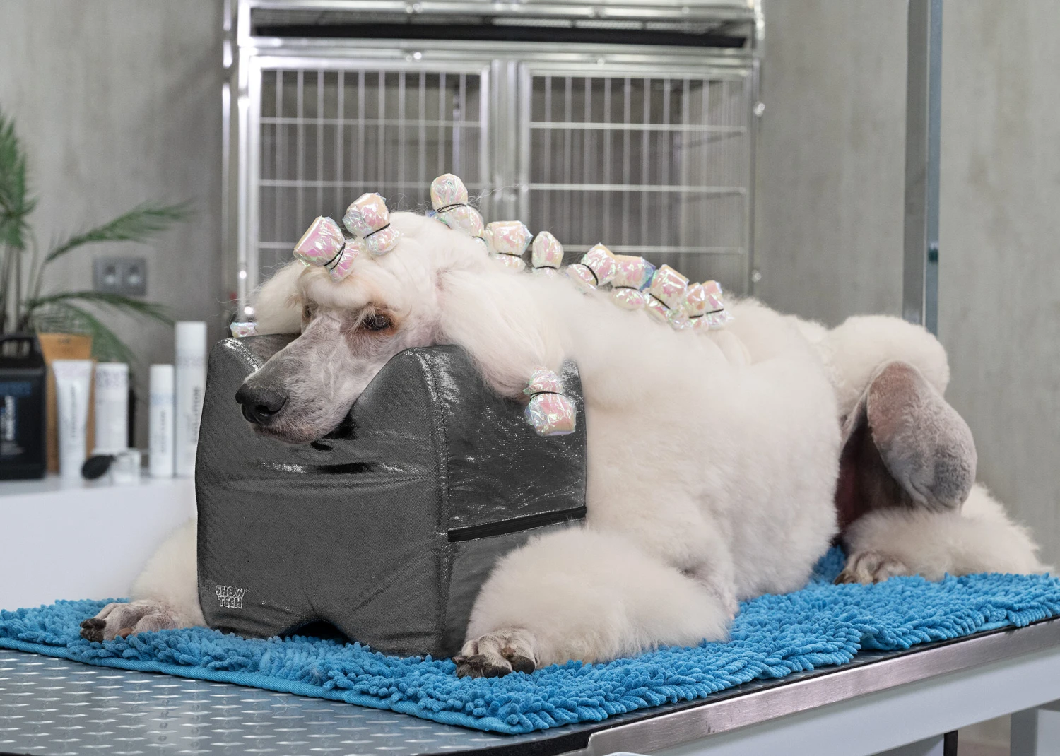 - Cushion designed to support the head of long-haired (show) dogs when making topknots